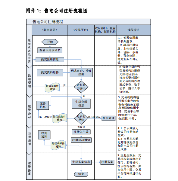 (3)規范指引由北京電力交易中心和各省電力交易中心聯合編制起草,并征求了北京電力交易中心市場管理委員會、有關省市場主體的意見。規范指引共分為六章,分別是總則、市場注冊程序、注冊信息變更、市場注銷、信用評價、附則,此外,還附有售電公司信用承諾書、售電公司公示信息、售電公司注冊申請表、售電公司變更申請表、售電公司注銷申請表、售電公司注冊信息、售電公司入市協議、授權委托書、注冊提交材料目錄清單及填寫說明等7個附件。