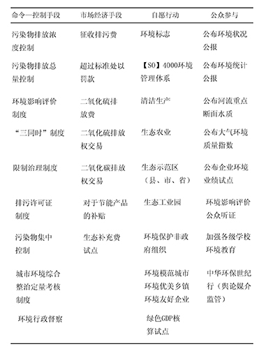 關(guān)于我國(guó)環(huán)境治理的實(shí)踐過(guò)程,張坤民等(2007) 建立了包栝命令—控制手段、經(jīng)濟(jì)刺激手段和公眾參與或稱(chēng)自愿手段等多樣化的環(huán)境政策工具矩陣。見(jiàn)表2.1