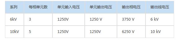 高壓電機節(jié)電系統(tǒng)根據(jù)電機額定電壓的不同,功率單元柜每相所串聯(lián)的個數(shù)也不同,6KV,10KV電壓與功率單元關(guān)系如下: