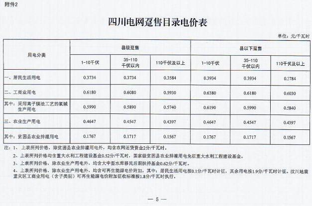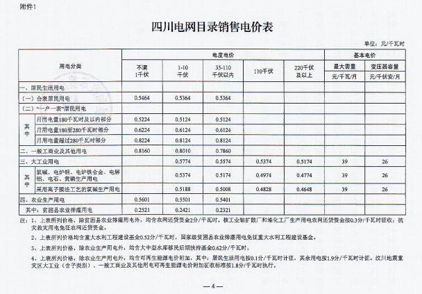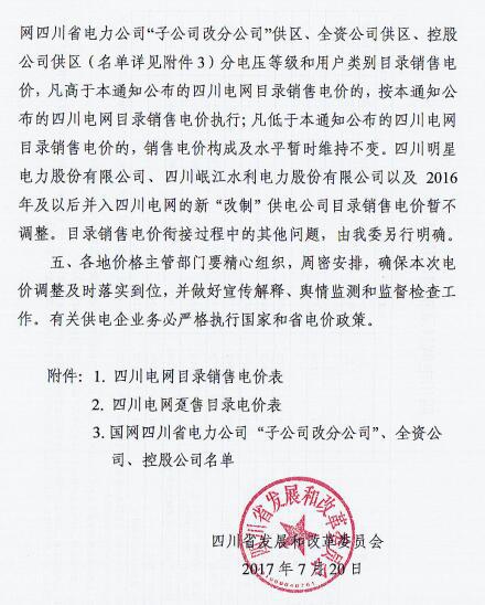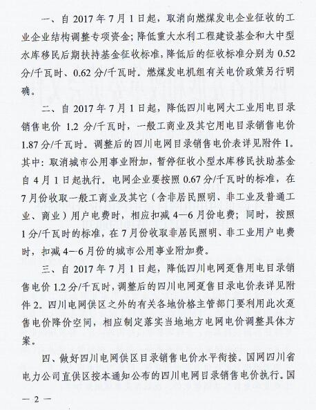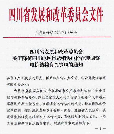 近日,四川省發(fā) 改 委發(fā)布了《四川省發(fā)展和改革委員會關于降低四川電網(wǎng)目錄銷售電價合理調整電價結構有關事項的通知》(以下簡稱“通知”)。通知指出,自2017年7月1日起,取消向燃煤發(fā)電企業(yè)征收工業(yè)企業(yè)結構調整專項資金,降低重大水利工程建設基金和中大型水庫移民后期扶持基金征收標準,降低后的征收標準分別為0.52分/千瓦時、0.62分/千瓦時。燃煤發(fā)電機組有關電價政策另行明確。具體情況如下:
