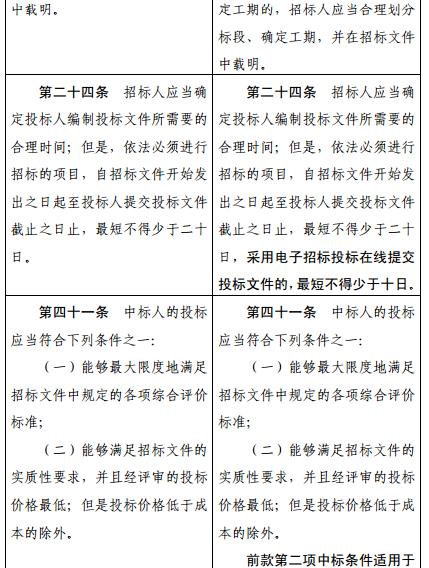 五、將第二十四條修改為:“招標(biāo)人應(yīng)當(dāng)確定投標(biāo)人編制投標(biāo)文件所需要的合理時(shí)間;但是,依法必須進(jìn)行招標(biāo)的項(xiàng)目,自招標(biāo)文件開(kāi)始發(fā)出之日起至投標(biāo)人提交投標(biāo)文件截止之日止,最短不得少于二十日,采用電子招標(biāo)投標(biāo)在線提交投標(biāo)文件的,最短不得少于十日。”