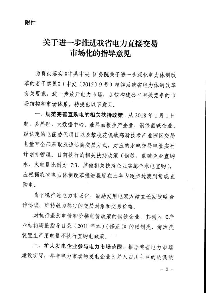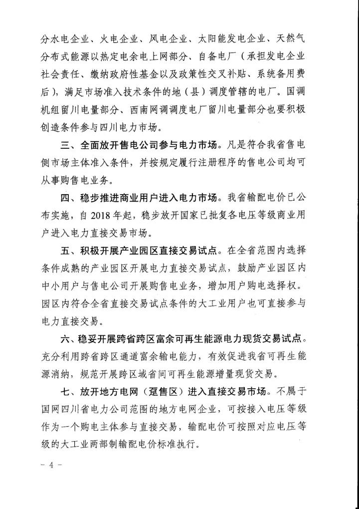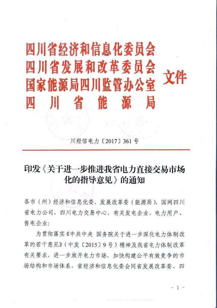 四川省經(jīng)信委、四川省發(fā) 改委、國(guó)家能源局四川監(jiān)管辦、四川省能源局日前聯(lián)合下發(fā)了《關(guān)于進(jìn)一步推進(jìn)我省電力直接交易市場(chǎng)化的指導(dǎo)意見》(以下簡(jiǎn)稱“意見”)。意見中稱,將規(guī)范完善直購電的相關(guān)扶持政策,擴(kuò)大發(fā)電企業(yè)參與電力市場(chǎng)范圍,全面放開售電公司參與電力市場(chǎng),穩(wěn)步推進(jìn)進(jìn)商業(yè)用戶進(jìn)入電力市場(chǎng),積極開展產(chǎn)業(yè)園區(qū)直接交易試點(diǎn),穩(wěn)妥開展跨省跨區(qū)富余可再生能源電力現(xiàn)貨交易試點(diǎn),放開地方電網(wǎng)(躉售區(qū))進(jìn)入直接交易市場(chǎng),有序推進(jìn)其他特殊行業(yè)企業(yè)完全電力市場(chǎng)化。詳情如下: