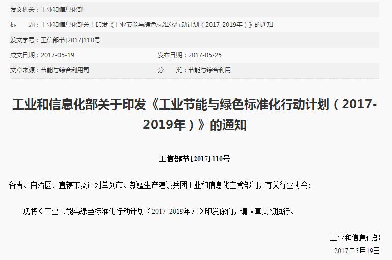 關于工信部印發(fā)《工業(yè)節(jié)能與綠色標準化行動計劃(2017-2019年)》的通知