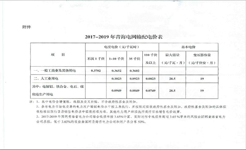 青海省發改委公布:2017—2019年青海電網輸配電價