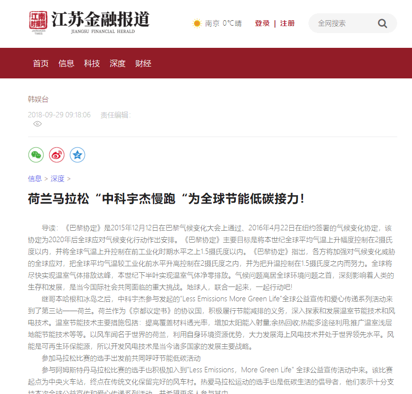 江南時報網:荷蘭馬拉松“中科宇杰慢跑“為全球節能低碳接力!