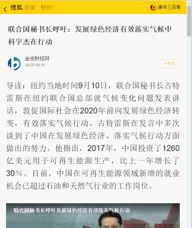 導讀:紐約當?shù)貢r間9月10日,聯(lián)合國秘書長古特雷斯在紐約聯(lián)合國總部就氣候變化問題發(fā)表講話,敦促國際社會在2020年前向發(fā)展綠色經(jīng)濟轉變,有效落實氣候行動。古特雷斯在發(fā)言中多次談到了中國在發(fā)展綠色經(jīng)濟、落實氣候行動方面做出的努力。他指出,2017年,中國投資了1260億美元用于可再生能源生產(chǎn),比上一年增長了30%。目前,中國在可再生能源領域新增的就業(yè)機會已超過石油和天然氣行業(yè)的工作崗位。