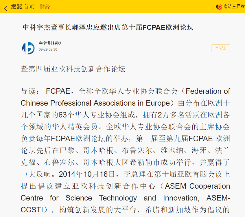 搜狐:中科宇杰應邀出席第十屆FCPAE歐洲論壇暨第四屆亞歐科技創(chuàng)新合作論壇