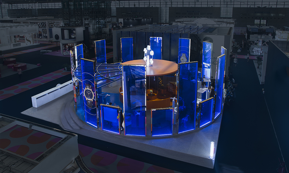 本次鐘表展,雷諾表突破以往封閉式的空間設(shè)計(jì),以全新的垂立藍(lán)色通透亞克力作為展廳的主要裝飾,使得整個(gè)展廳充滿通透感又充極具科技特質(zhì)。展廳設(shè)計(jì)為圓形,與腕表表盤的形狀相呼應(yīng),整個(gè)展廳展臺(tái)以腕表中一到十二的羅馬數(shù)字形式呈現(xiàn)。令觀展者仿佛置身于表盤之中,體驗(yàn)奇妙的空間感,穿梭于時(shí)空之中。