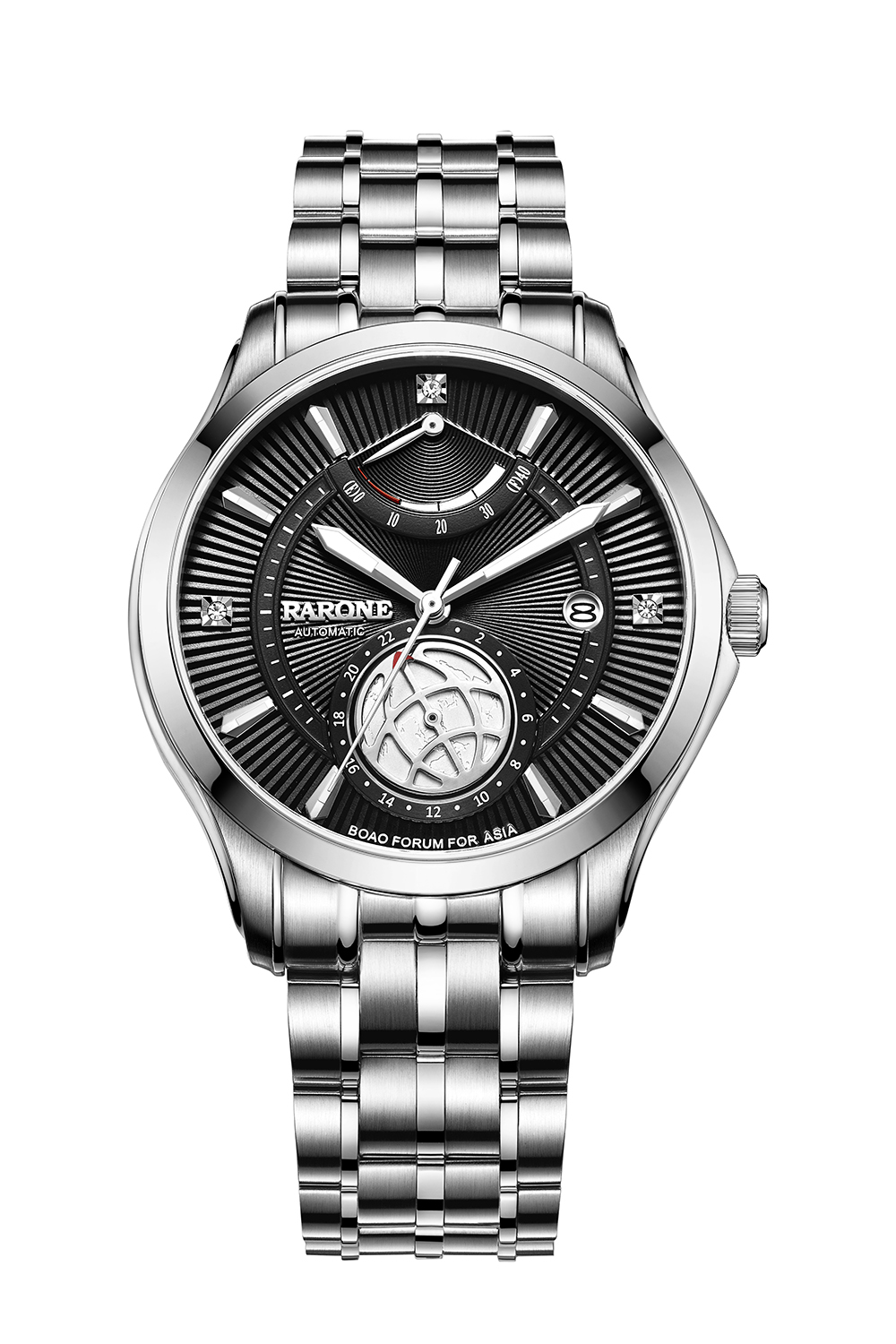 “博鰲·鼎智系列”是雷諾表專門為博鰲亞洲論壇的政商精英而設計的。雷諾表從2009年起成為博鰲論壇官方商務禮賓用表,至今已連續合作7年。12時位40小時動力儲存顯示,飛返式指針顯示能量,隨時掌控機械機心動力余量;6時位鏤空地球經緯度指針,底紋為亞洲地圖,24小時功能,每24小時轉一圈,與地球自轉1圈時間同步,意義非凡。